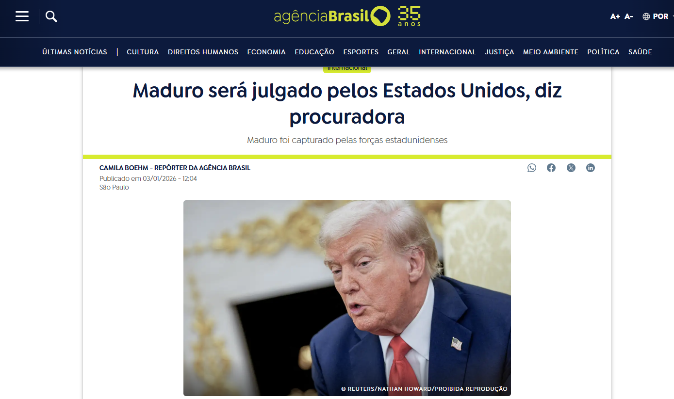 A primeira matéria sobre o sequestro de Maduro publicada pela Agência Brasil usa o termo “capturado”, explicável do ponto de vista da urgência de se dar a notícia e sob que ponto de vista foi dada. No caso, a declaração do próprio presidente dos Estados Unidos, Donald Trump.