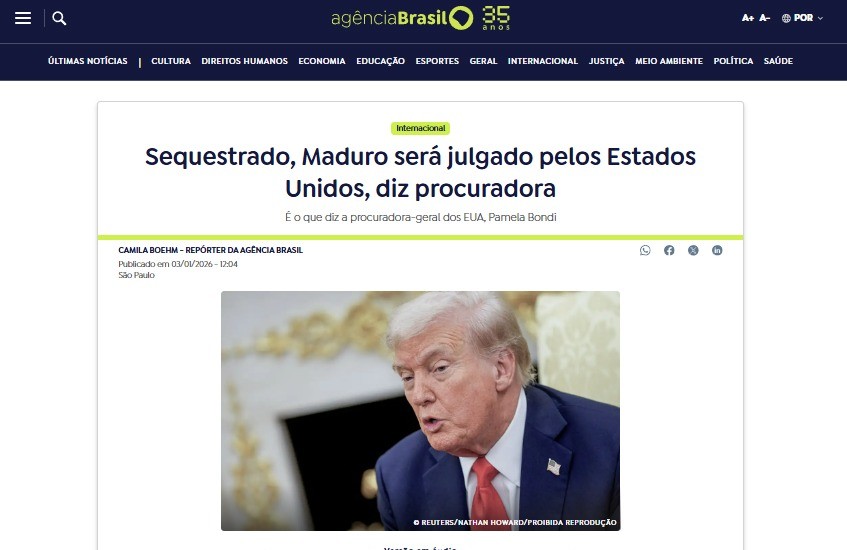 A primeira matéria sobre o sequestro de Maduro publicada pela Agência Brasil usa o termo “capturado”, explicável do ponto de vista da urgência de se dar a notícia e sob que ponto de vista foi dada. No caso, a declaração do próprio presidente dos Estados Unidos, Donald Trump.